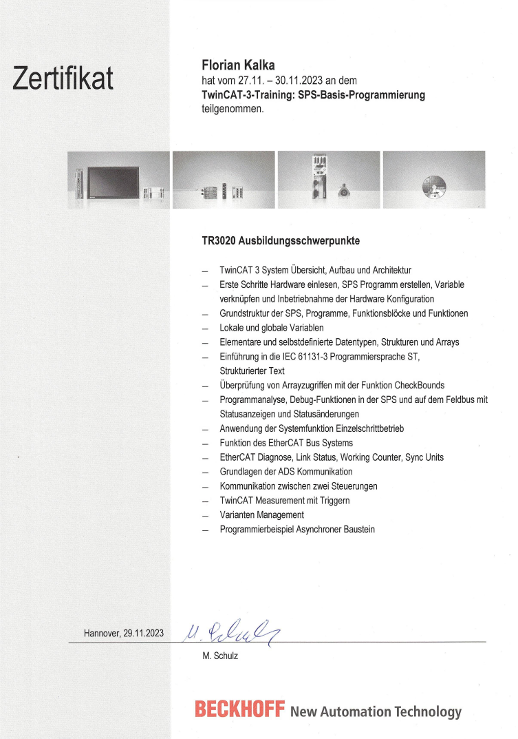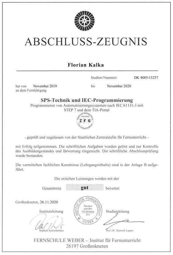 | 2019-2020 | SPS-Technik und IEC-Programmierung der Fernschule Weber |